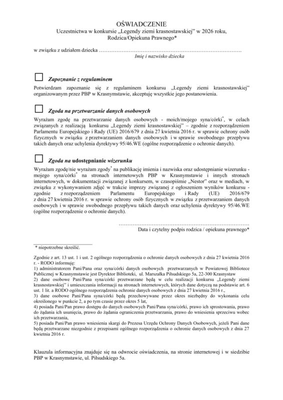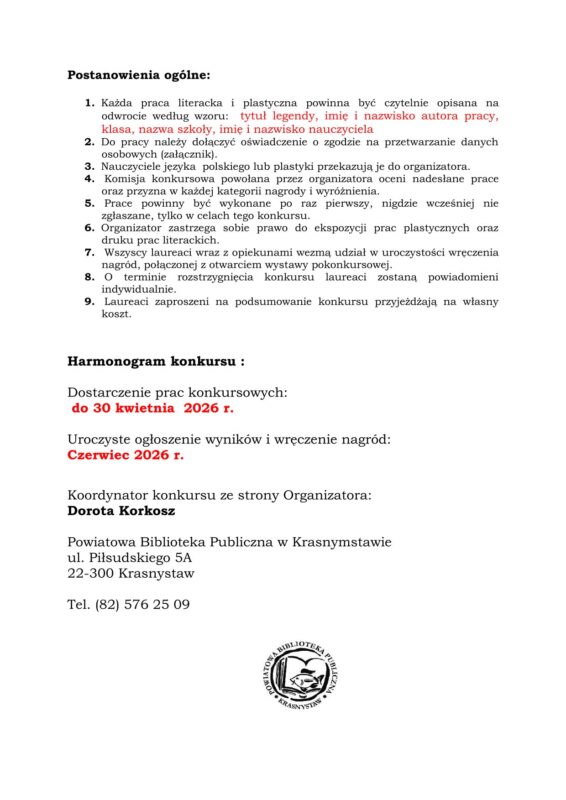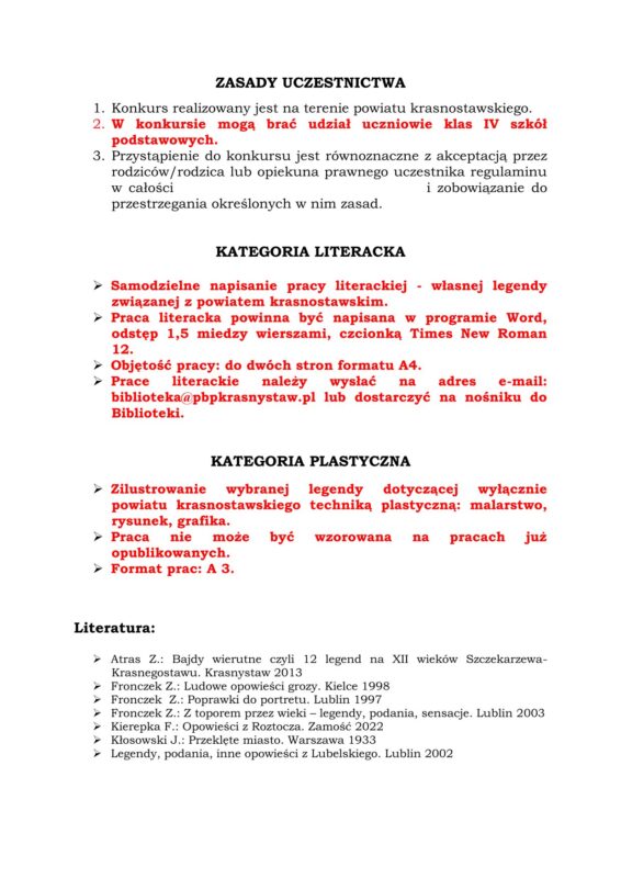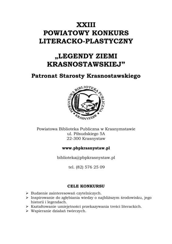 Zapraszamy Was do udziału w XXIII Powiatowym Konkursie Literacko-Plastycznym „Legendy Ziemi Krasnostawskiej”!
